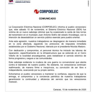 La Corporación Eléctrica Nacional (Corpoelec) informa al pueblo venezolano que, este sábado 15 de noviembre, el Sistema Eléctrico Nacional (SEN) fue objeto de un nuevo sabotaje criminal que ocasionó la caída de tres torres de transmisión en el municipio Juan Antonio Sotillo del estado Anzoátegui.