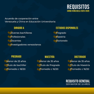 El Ministerio del Poder Popular para la Educación Universitaria anunció el inicio del proceso de postulaciones para el Plan de Becas de Gobierno entre la República Bolivariana de Venezuela y la República Popular China, a través de Fundayacucho, que permitirá realizar estudios especializados en el gigante asiático con una beca del Gobierno Bolivariano y cuyas inscripciones se llevarán a cabo desde el 5 de noviembre de 2024 hasta el 22 de febrero del 2025.