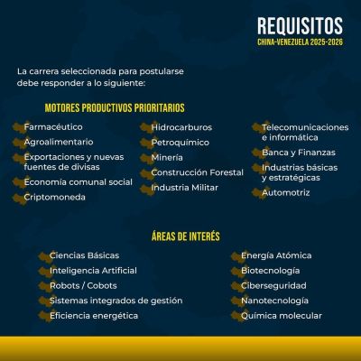 “Este programa representa una oportunidad invaluable para nuestros jóvenes y profesionales, enmarcado dentro de los 18 motores productivos de nuestra nación y alineado con las carreras del futuro”, señaló el ministro Ricardo Sánchez, en su cuenta de Instagram, al anunciar el proceso instruido por el presidente Nicolás Maduro Moros.