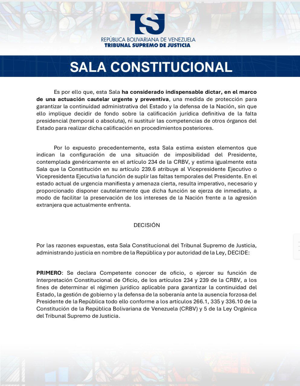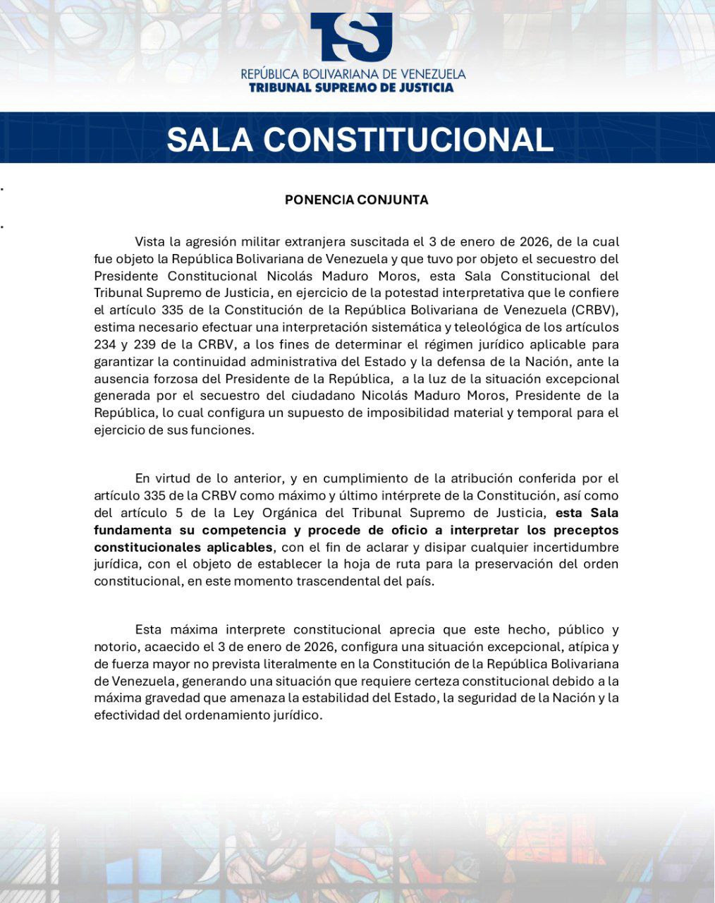 En un comunicado, ofrecido por la magistrada Tania D’Amelio, explicó que en vista de la agresión militar extranjera suscitada el 03 de enero de 2026, de la cual fue objeto la República Bolivariana de Venezuela y que tuvo por objeto el secuestro del presidente constitucional, Nicolás Maduro Moros, esta Sala Constitucional del TSJ, en ejercicio de la potestad interpretativa que confiere el artículo 335 de la Constitución, estima necesario efectuar una interpretación sistemática y teleológica de los artículos 234 y 239 de la CRBV.