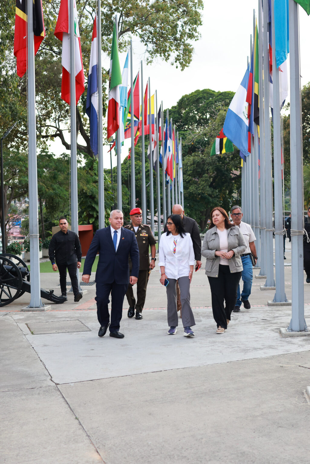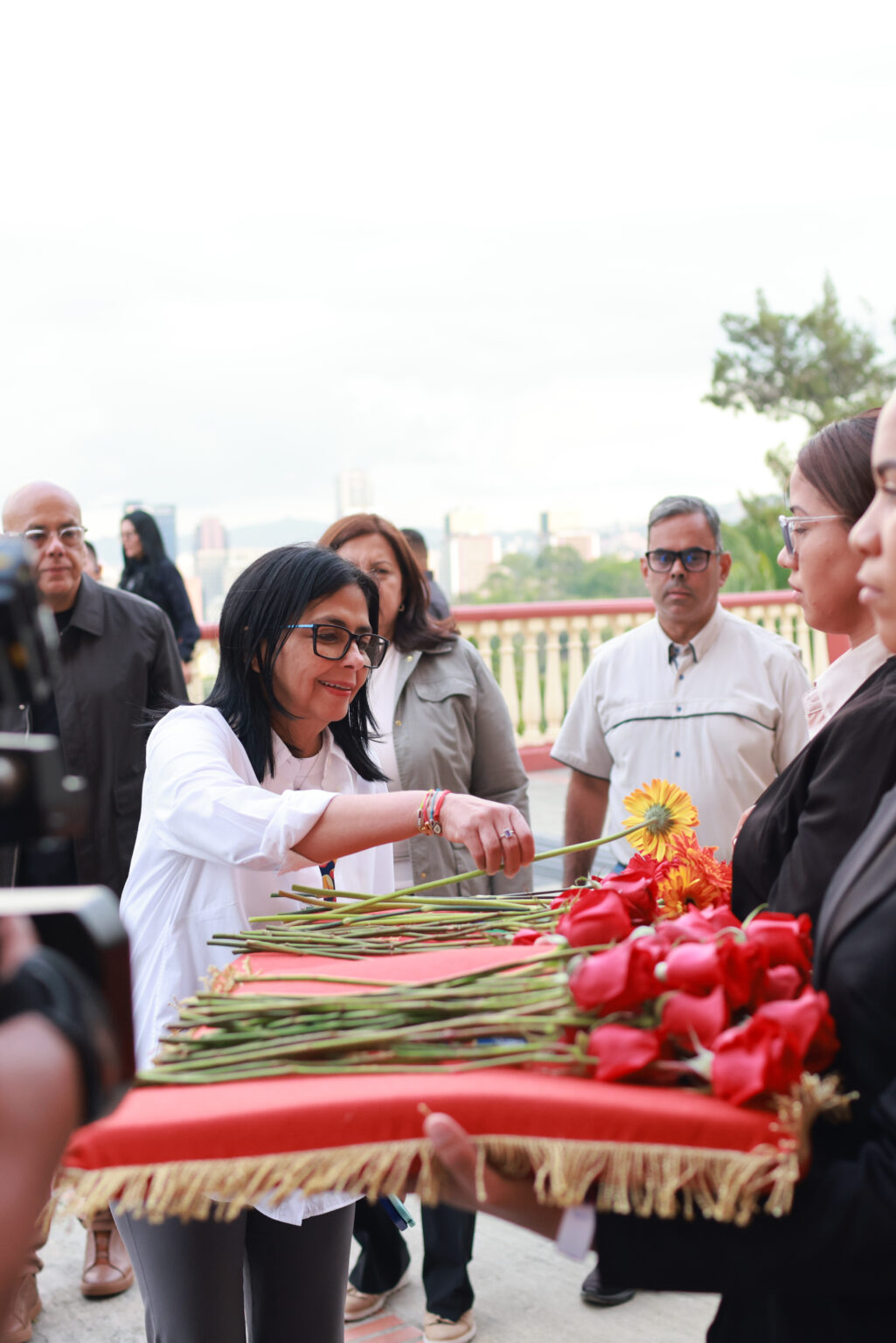 A su llegada al recinto histórico, la Presidenta Encargada inició un recorrido solemne por el Bosque de Banderas, un espacio que rinde tributo a la unión latinoamericana y caribeña. Tras recoger una ofrenda floral en la entrada del cuartel, se dirigió al monumento conocido como «La Flor de los Cuatro Elementos», obra del arquitecto Fruto Vivas, donde reposan los restos del líder de la Revolución Bolivariana, Comandante Eterno, Hugo Rafael Chávez Frías.