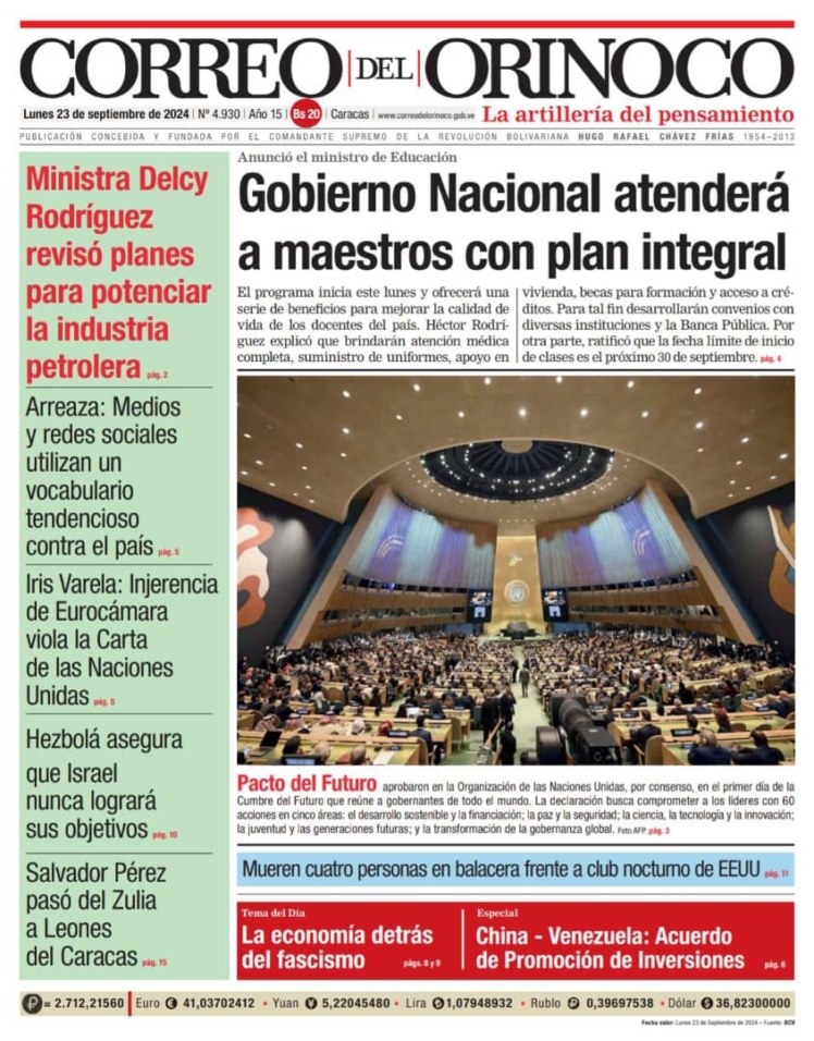 Edición Impresa Correo del Orinoco N° 4.930 23 de septiembre de 2024 Edición Impresa Edición Impresa Correo del Orinoco N° 4.930 Lunes 23 de septiembre de 2024 Previous Post La Artillería N° 676 Next Post Ministro Rodríguez anunció plan para atender a maestros del país