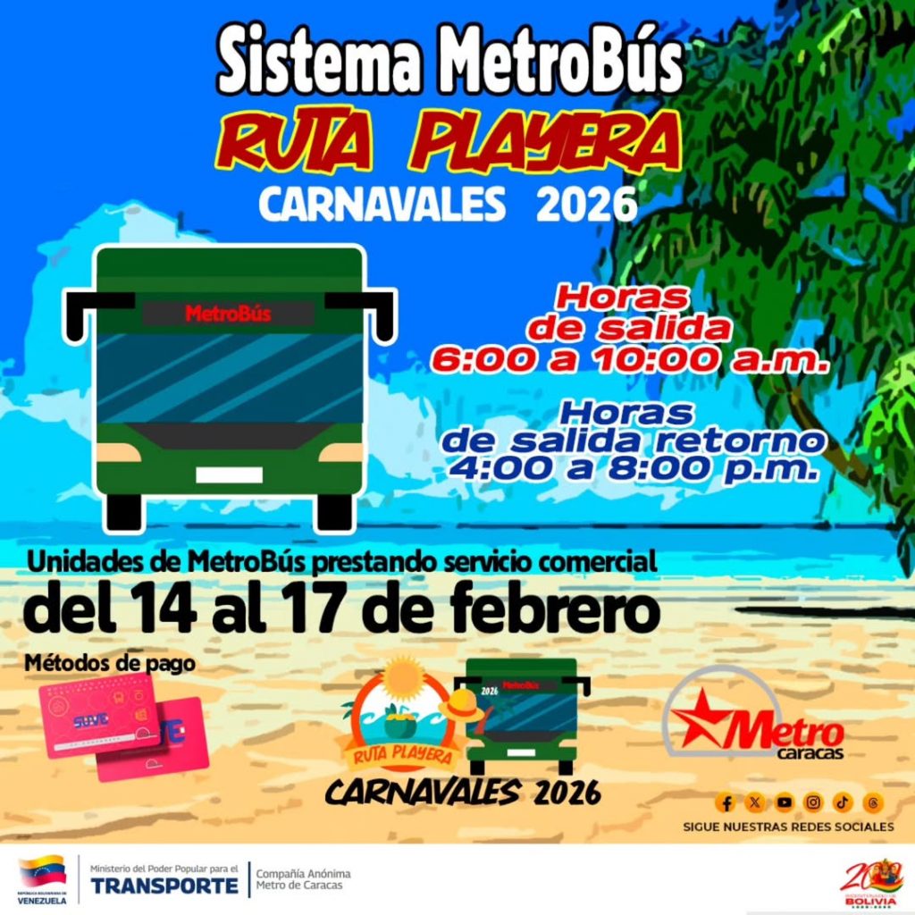 Desde este sábado 14 y hasta el martes 17 de febrero, el Metro de Caracas activa nuevamente la Ruta Playera del MetroBús por los Carnavales 2026, para ofrecer el traslado cómodo y seguro de temporadistas hasta el estado La Guaira.