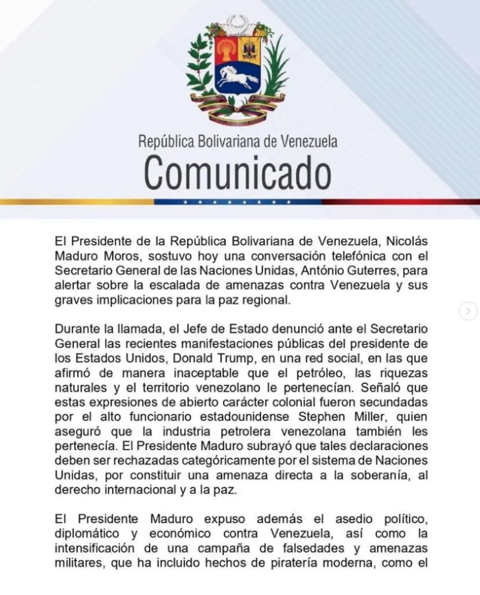 El presidente de la República Bolivariana de Venezuela, Nicolás Maduro Moros, sostuvo una conversación telefónica con el secretario general de las Naciones Unidas, António Guterres, para alertar sobre el incremento de amenazas contra el país y sus implicaciones para la paz y la estabilidad regional.