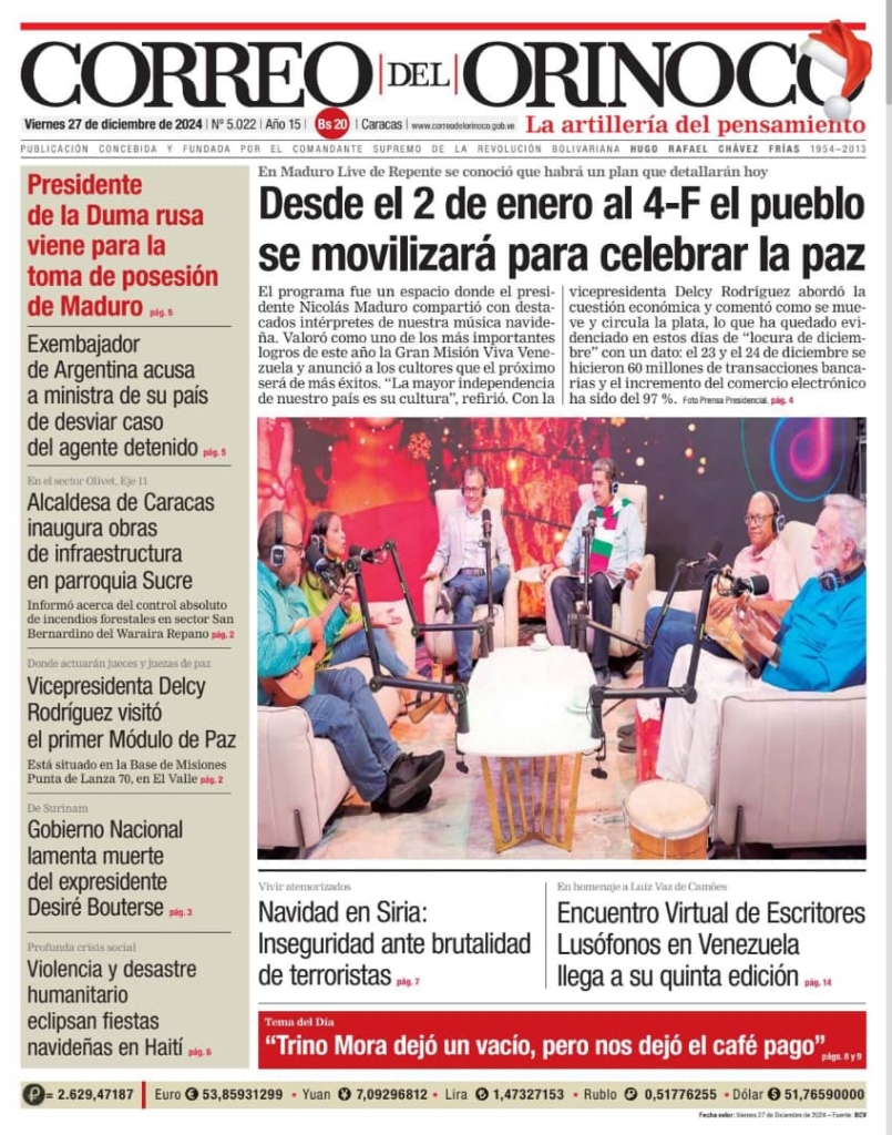 Edición Impresa Correo del Orinoco N° 5.022 27 de diciembre de 2024 by MARIA JOSE ARIAS FERNANDEZ Edición Impresa Edición Impresa Correo del Orinoco N° 5.022 Viernes 27 de diciembre de 2024