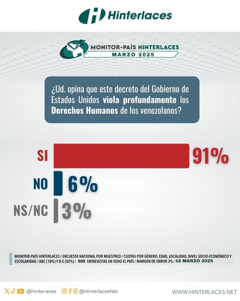 El reciente estudio del Monitor País Hinterlaces reveló que el 91% opina que el decreto del gobierno de Estados Unidos, basado en la Ley de Enemigos Extranjeros, viola profundamente los Derechos Humanos de los venezolanos, luego de que un grupo de co ...
