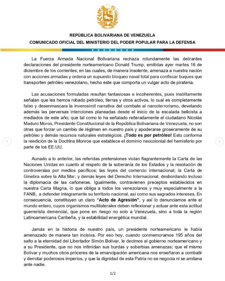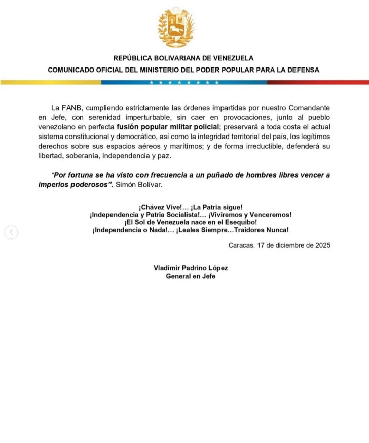 La Fuerza Armada Nacional Bolivariana (FANB) manifestó su absoluto rechazo a las recientes declaraciones del presidente de los Estados Unidos, Donald Trump, quien ha ordenado un bloqueo naval contra Venezuela con el fin de confiscar buques petroleros. El comunicado, presentado por el Ministro del Poder Popular para la Defensa, General en Jefe Vladimir Padrino López, califica estas intenciones como un «vulgar acto de piratería» que atenta contra los principios más elementales del derecho internacional.