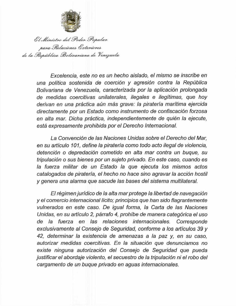 Enfatiza que no existe ninguna resolución del Consejo de Seguridad que autorice a Estados Unidos a ejecutar abordajes violentos o confiscaciones contra Venezuela. Mientras, advierte que «tolerar o normalizar este tipo de conductas equivaldría a legitimar el caos en la navegación marítima internacional».