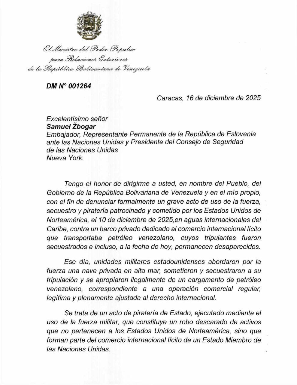 Venezuela formalizó este martes su denuncia ante el Consejo de Seguridad de las Naciones Unidas acusando al Gobierno de los Estados Unidos de cometer actos de «piratería de Estado» y secuestro, tras la incautación de un buque petrolero.