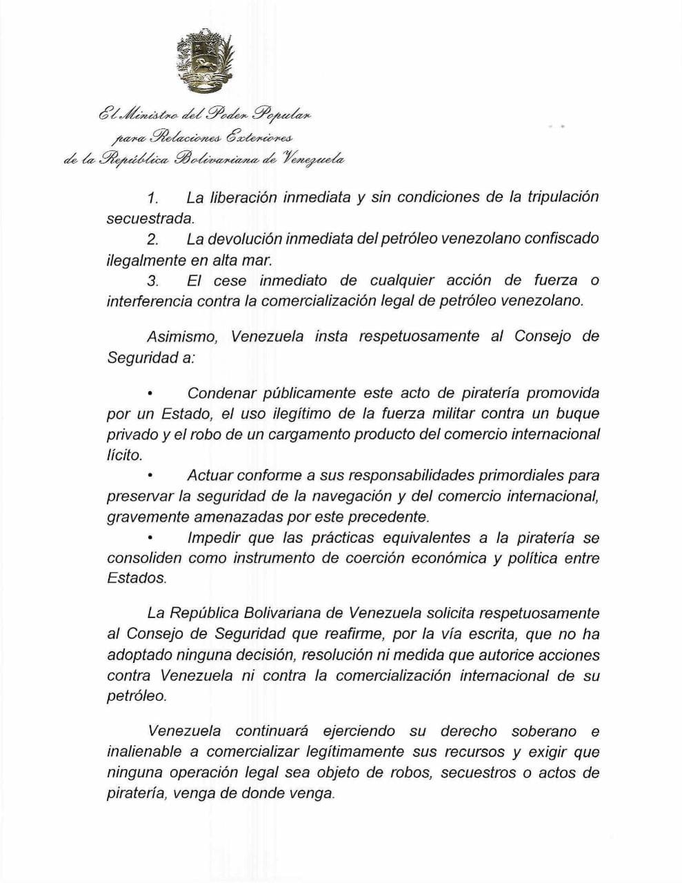 Ante la gravedad de los hechos, Venezuela presenta tres exigencias directas al Gobierno de los Estados Unidos: La liberación inmediata y sin condiciones de la tripulación secuestrada, primero. La devolución inmediata del petróleo venezolano confiscado ilegalmente, en segundo, y el cese inmediato de cualquier interferencia contra la comercialización legal de los recursos venezolanos.