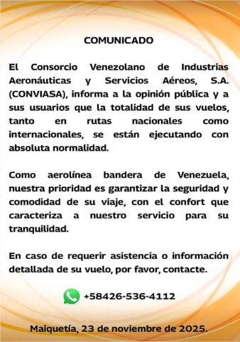 Estas declaraciones se suman a las emitidas previamente por otras aerolíneas nacionales, como Laser Airlines y Avior Airlines, que también aseguraron continuidad plena de sus operaciones. Las comunicaciones buscan brindar tranquilidad a los pasajeros venezolanos y extranjeros en medio del reajuste temporal realizado por varias aerolíneas internacionales.