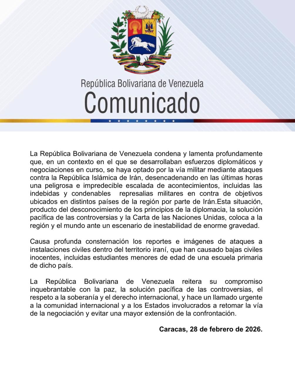 La República Bolivariana de Venezuela, a través de un comunicado, condenó los ataques a la República Islámica de Irán, ocurridos este sábado 28 de febrero.