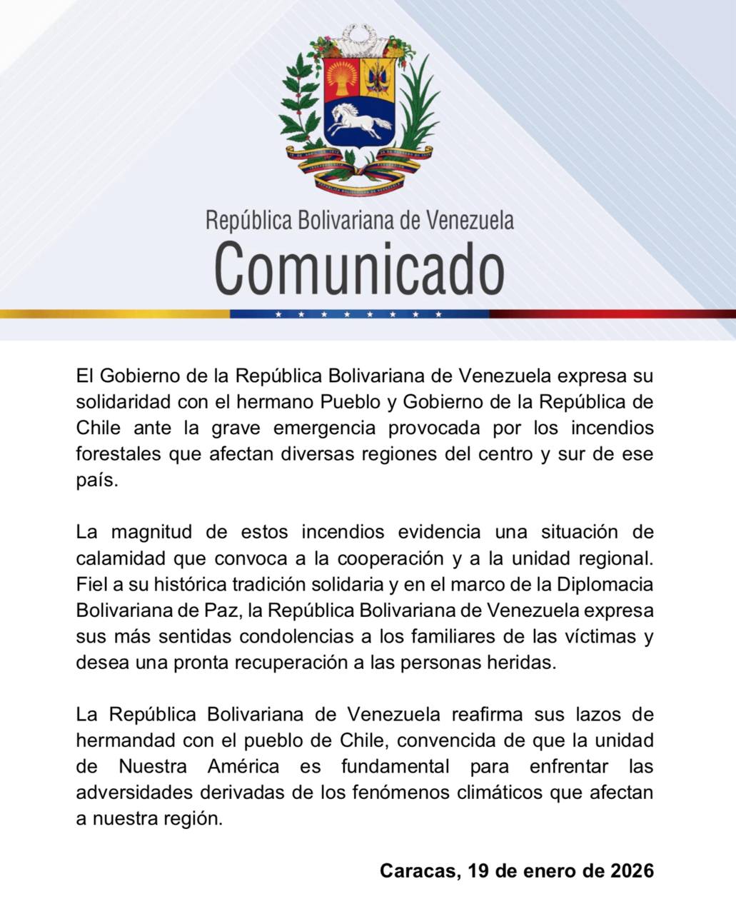 El Gobierno de la República Bolivariana de Venezuela expresa su solidaridad con el hermano Pueblo y Gobierno de la República de Chile ante la grave emergencia provocada por los incendios forestales que afectan diversas regiones del centro y sur de ese país.